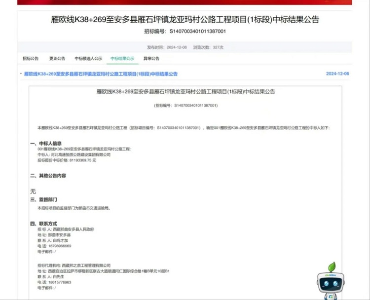 此次中標(biāo)的雁歐線K38+269至安多縣雁石坪鎮(zhèn)龍亞瑪村公路工程項(xiàng)目(1標(biāo)段),中標(biāo)金額高達(dá)8119.336975萬元。該項(xiàng)目位于西藏自治區(qū)安多縣境內(nèi),全長約35.364公里(含短鏈8.074米),起點(diǎn)位于雁歐線K38+269處,終點(diǎn)位于龍亞瑪村村委會。該項(xiàng)目的實(shí)施將有效解決龍亞瑪村的交通問題,為當(dāng)?shù)卮迕裉峁└颖憬、安全的出行條件,同時也將進(jìn)一步完善西藏地區(qū)的交通網(wǎng)絡(luò),促進(jìn)區(qū)域經(jīng)濟(jì)發(fā)展。